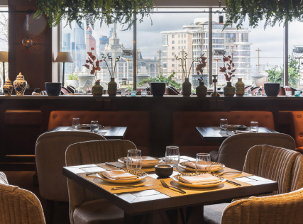 На седьмом этаже гостиницы Lotte Plaza расположился вместительный, рассчитанный на 240 посадочных мест, ресторан Levantine с панорамными окнами и потрясающим видом на Москву.